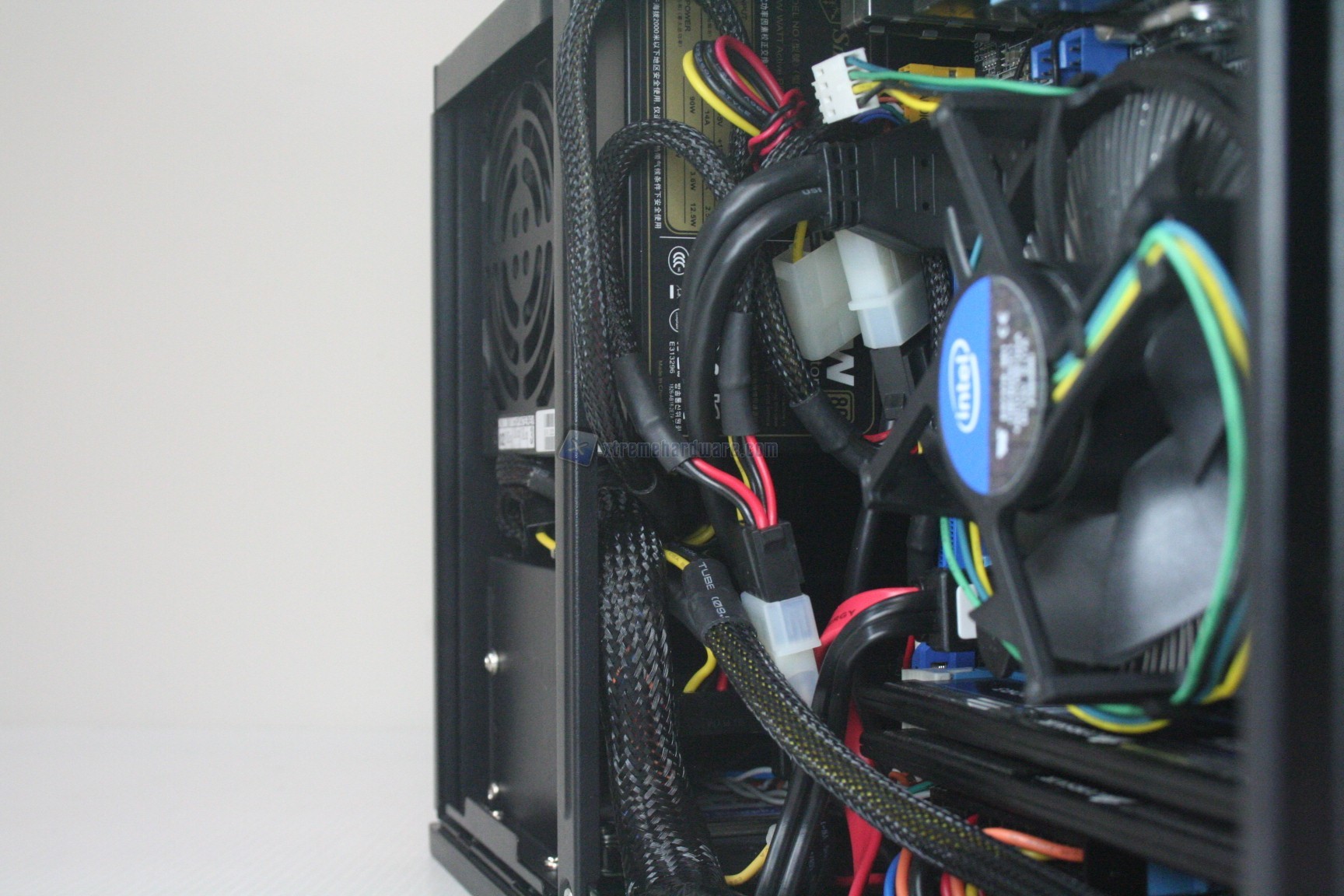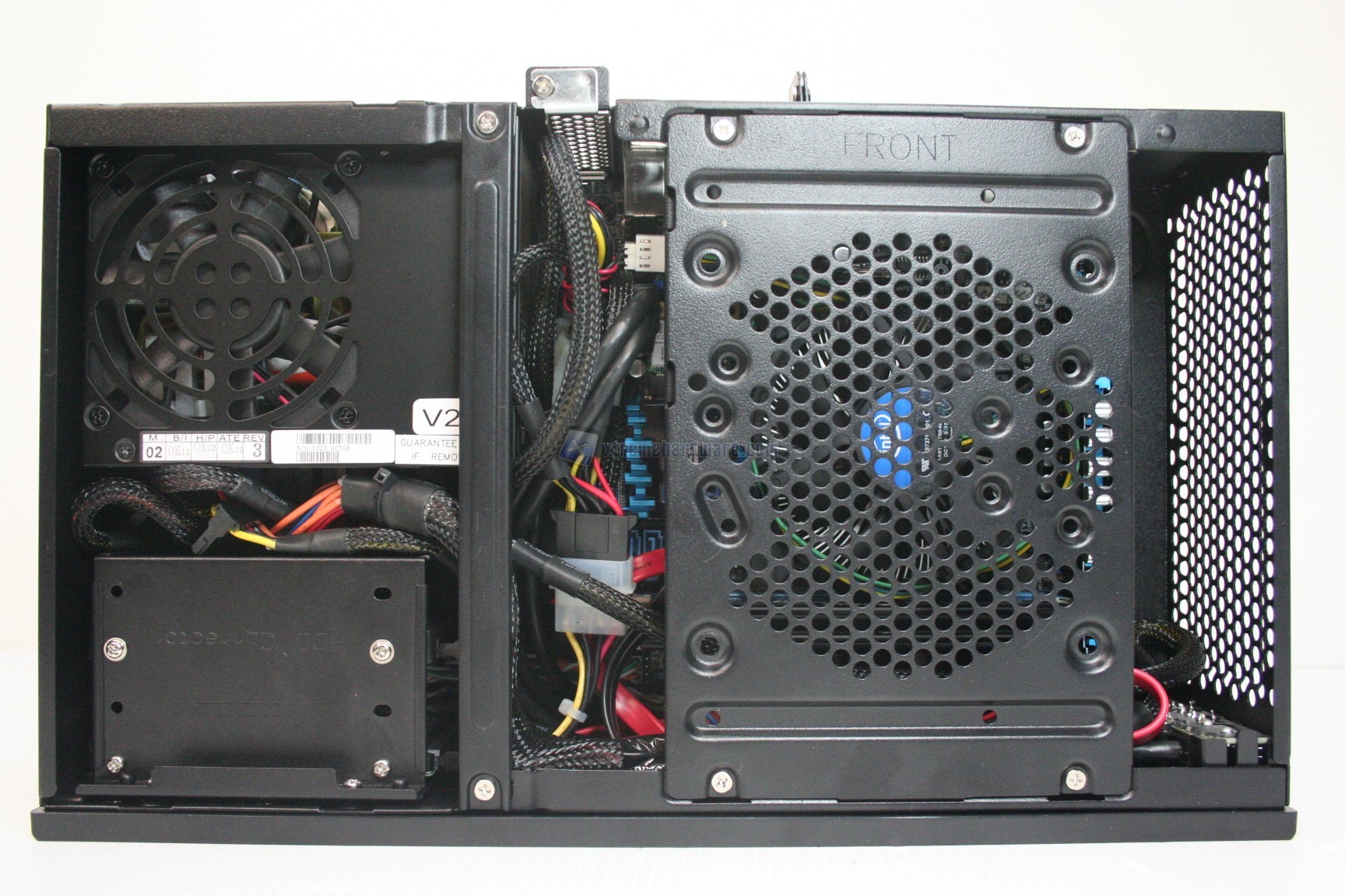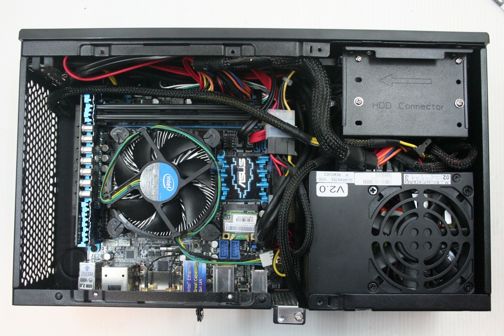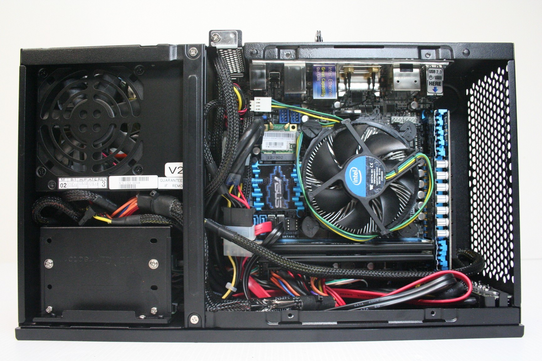 In questo paragrafo analizzeremo velocemente il montaggio di un sistema Intel, ed il conseguente cablaggio posteriore ed anteriore. Anche per gli utenti poco esperti la procedura è molto facile. Si consiglia l’acquisto di un dissipatore aftermarket low profile, e soprattutto di un alimentatore SFX perfettamente compatibile. Sconsigliamo l’utilizzo dell’alimentatore Seasonic 300W SFX in quanto non pienamente compatibile, ed altresì consigliamo l’utilizzo del modello SFX 450W SilverStone con certificazione 80plus Gold, mostrato in precedenza. Per prima cosa dovrete aprire la paratia superiore e smontare il plate di ritenzione per l’hard disk supplementare da 3.5”. Smontato questo si procede con l’installazione dell’alimentatore, poi dei dischi da 2.5” ed infine della scheda madre, con il dissipatore già preinstallato. Se si possiede un dissipatore Intel, tramite il solito sistema Push-Pin, sarà possibile installarlo successivamente, altrimenti se volete potete già procedere ad installare il backplate del dissipatore della CPU, facendo attenzione a stendere un sottile velo di pasta termica alla base della CPU stessa. Ricordiamo che non è presente nessun foro posteriore, né paratie passacavi. Fatto questo è necessario connettere il connettore da 20+4 pin, da 8 pin se presente, il connettore Sata DATI per gli hard disk ed il loro connettore di alimentazione. Una volta connesso il cavo di connessione a 3/4PIN della ventola del dissipatore della CPU, siamo pronti all’accensione.